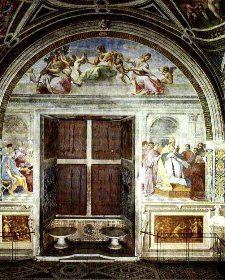 Kardinals- und Gottestugenden und das Gesetz Auf der Wand gegenüber dem "Parnass" werden die Kardinalstugenden und die drei theologischen Tugenden als Ausdruck des subjektiven Guten gezeigt: die Kraft trägt einen Eichenzweig, die Klugheit mit doppeltem Gesicht, bewundert sich im Spiegel, die Mäßigung hält die Zügel - und die Gerechtigkeit ist auf dem Deckengewölbe gemalt. Die theologischen Tugenden werden in Form von kleinen Putten dargestellt: Der Glaube weist zum Himmel, die Hoffnung hält eine Fackel hoch, die Liebe schüttelt Eichen vom Baum der Stärke. Unter dem Fenster sind zwei historische Szenen dem kirchlichen und weltlichen Recht, der Verkörperung des objektiven Guten gewidmet. Links übergibt der heilige Raimund von Penafort Papst Gregor IX. die Dekretalen (Julius II. als Gregor IX., ihm zur Linken erkennt man seine drei Lieblingskardinäle: Giovanni di Medici, der spätere Clemens VII., hinter ihm Alessandro Farnese (Paul III.) und Antonio del Monte). Die Ausführung der Übergabe der Pandekten an Kaiser Justinian stammt von Lorenzo Lotto. |