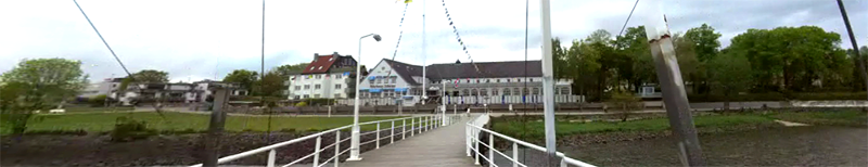 Die Promenade vor dem Schulauer Fährhaus bildet den Vordergrund. Der Blick schweift über den Schulauer Hafen hinweg und über die Strandbad-Bucht bis zum Radar-Turm des Wasser- und Schifffahrtsamtes, der als Teil einer Radar-Kette zur sicheren Fahrt von Schiffen auf der Elbe beiträgt. Im linken mittleren Teil des Bildes zieht sich die Insel Hanskalbsand in etwa bis zum Bildzentrum hin, rechts davon ist bei guter Sicht das südliche Elbufer mit Lühe und dem Alten Land zu erkennen.