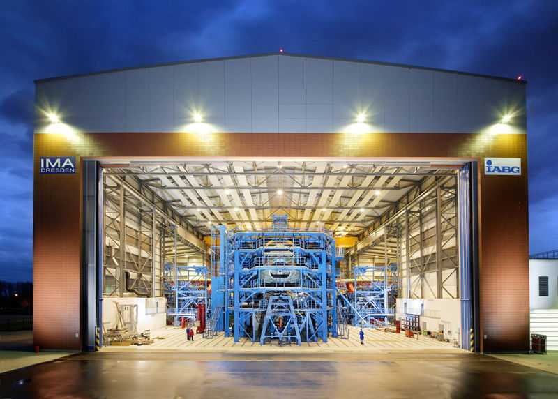 Versuchsaufbau Strukturtest IABG Dresden 07.April 2005 - Ein speziell für Strukturbelastungstests gebautes Exemplar (MSN 5001), welches nie fliegen wird, wird seit September 2005 bis voraussichtlich 2008 in der Flugzeugwerft Dresden in einer eigens dafür erbauten IABG-Testhalle einem Ermüdungsversuch unterzogen. Dabei werden 47.500 Flugzyklen simuliert, was etwa einem 25-jährigen Flugzeugleben entspricht. Nach erfolgreich bestandenen 5.000 Zyklen darf das erste Flugzeug an Kunden ausgeliefert werden.