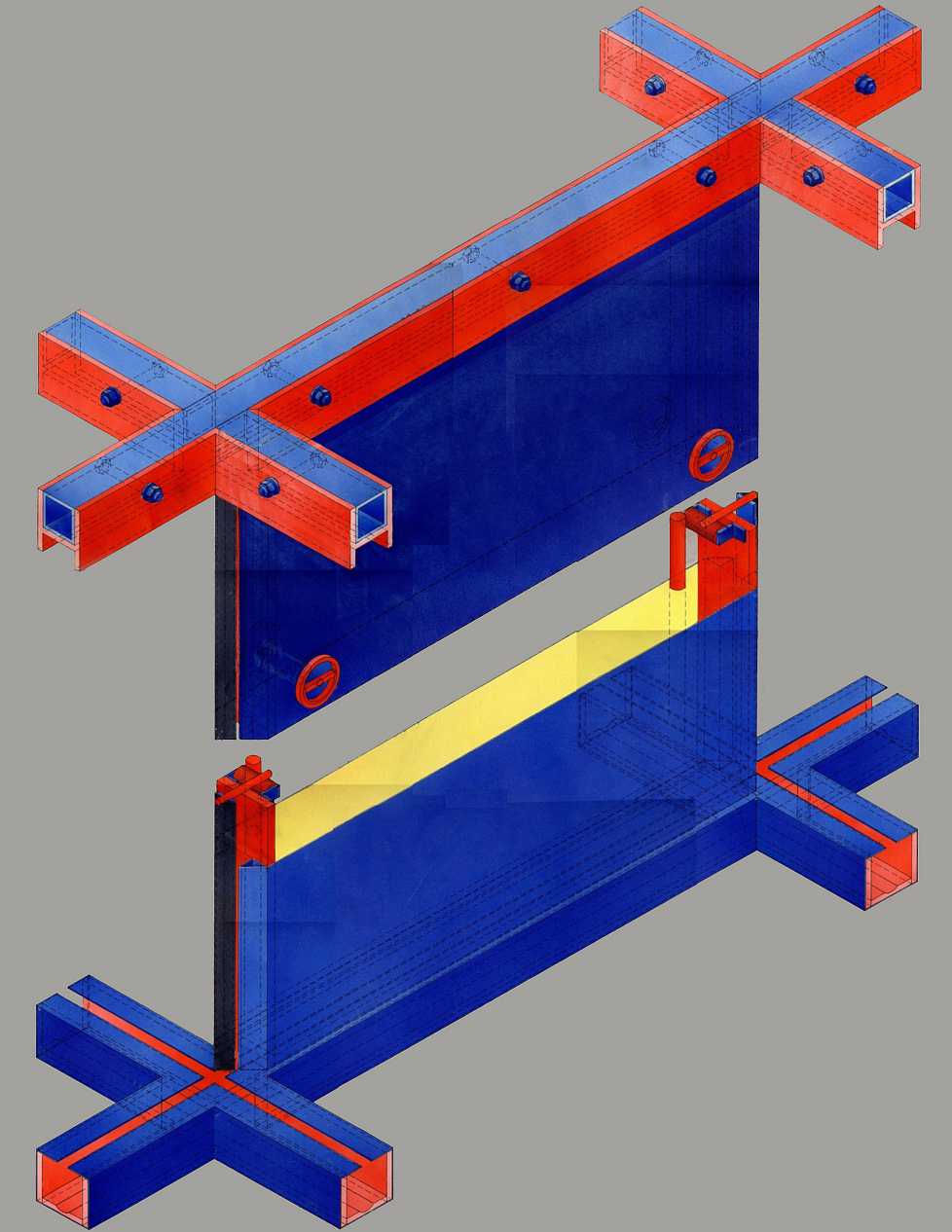 Die Idee sind Wandelemente, die über Boden und Deckenschienen bewegt werden können, und entgegen den herkömmlichen Möglichkeiten in beide Richtungen zur Umgrenzung von jeglichen Raumformen (z.B. im Messebau), zu schieben und zu arretieren sind.
