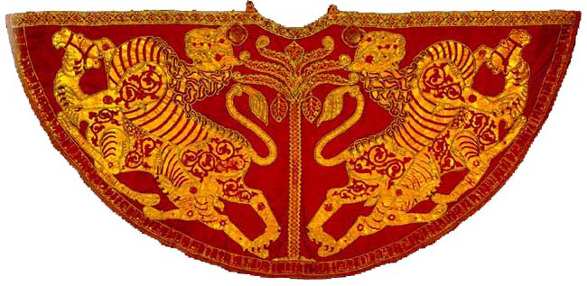 Krönungsmantel: byzantinischer Seidenstoff bestickt, 3,4 m breit, 11 kg schwer, 1133 n.Chr. Erste Überlieferungen berichten von der Entdeckung des Farbstoffes bei den Phöniziern. Von dem Griechen Konstantion Paleokappa ist eine Legende überliefert, wonach ein Hund am Strand eine Purpurschnecke gefressen habe und dessen Schnauze sich dabei rot verfärbte. Der Hirte glaubte, der Hund habe sich verletzt und wischte dessen Schnauze mit einem Tuch ab. Dabei merkte er, dass die rote Farbe von der Färbekraft der Schnecke stammte. Die Phönizier fingen die Schnecken und wurden durch die vielen Farbabstufungen der leuchtenden Purpurfärbungen berühmt. Daher erklärt sich der griechische Name für Phönizien, er bedeutet "Purpurland". Die heute bekannte älteste Purpurfärberei befindet sich in Ugarit (Syrien). Noch heute kann man am Strand des Südhafens von Sidon im Libanon meterhohe Schalenreste finden. Viele Bibelstellen zeugen von der Wichtigkeit dieses Farbstoffes für kultische Zwecke. Danach trugen es die Könige Israels und die Kaiser von Persien. Einen purpurnen Mantel legten die Knechte des römischen Landpflegers Pontius Pilatus dem Jesus um, gaben ihm die Krone aus Dornen auf das Haupt und ein Zepter aus Rohr in die rechte Hand, ehe sie ihn als "König der Juden" verspotteten, geißelten und schließlich kreuzigten. (MATTHÄUS 27,28-30). So ist überliefert, dass Alexander der Grosse beim Tode seines Freundes Hephestion dessen Scheiterhaufen mit Purpur drapieren lässt. Aus späteren Zeiten wird berichtet, dass die Segel der Galeeren Cleopatras in echtem Purpur waren. Purpur wurde nur zum Färben verwendet. Ein Purpurpigment zum Malen gab es nicht, liess sich doch der Farbton mit Indigo und einem Rotton gut imitieren. Wer es in Rom zu Zeiten Neros wagte, Purpur zu kaufen oder gar zu tragen, verlor sein Hab und Gut und wurde mit dem Tod bestraft. Etliche Erben des kaiserlichen Throns erhielten den Zusatz porphyrogenet - im Purpur geboren. Mit dem Fall von Byzanz im Jahre 1453 geht auch die Ära des königlichen Purpurs zu Ende. Er gerät in Vergessenheit. Im Jahre 1468 wurde von Papst Paul II. das Purpurrot für Kardinäle offiziell eingeführt. Die purpurroten Trachten der Kardinäle und die Mäntel der deutschen Kaiser waren aber meistens nicht mehr mit Purpur aus den Schnecken gefärbt, sondern benutzten einen aus Kermesläusen gewonnen Farbstoff (Conchenille). Schon in der Antike hatte man versucht, den aufwendig herzustellenden Purpur durch billigere Farbstoffe wie Krapp zu ersetzen.