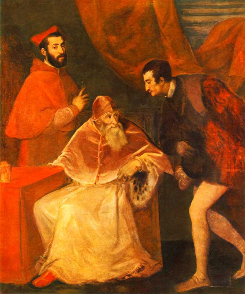 Tiziano Vecelli: Papst Paul III. mit seinen Nepoten (1545)Museo Nazionale, Neapel Tizian stellt auf seinem Gemälde außer Papst Paul III. in päpstlichem Weiß links einen von dessen Söhnen, den Kardinal Alessandro Farnese, und rechts einen von seinen Enkeln, den Herzog Ottavio Farnese, dar. Den Kardinal zeigt er in dem Rot der Nachfolge Christi, dem Zeichen seiner geistlichen Würde, den Herzog dagegen in dem Purpur der Macht und Vornehmheit, dem Zeichen seiner weltlichen Würde, gekleidet. Bemerkenswert ist auch der purpurne Hintergrund und der Abglanz von Purpur auf dem päpstlichen Weiß. |