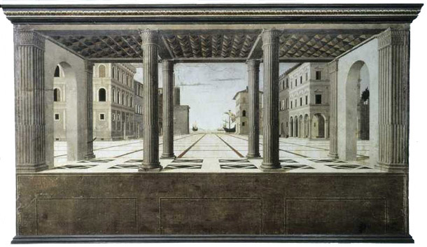 Piero della Francesca nannte sein Gemälde wirklich so. Alledings ging es wohl nicht darum, zu zeigen, wie eine Ideale Stadt aussieht, sondern Piero wollte allen beweisen, daß er die Zentralperspektive unglaublich gut beherrschte. Ideale Stadt, gemalt ca. 1470, Öl auf Holz, 60 x 200 cm, Nationalgalerei in Urbino