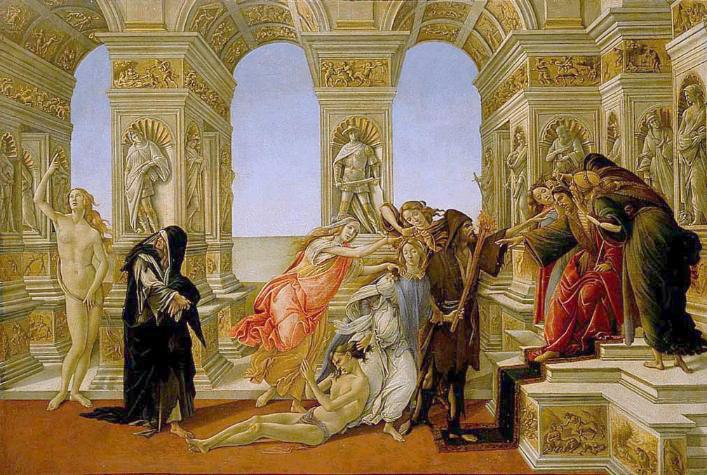 Dieses Gemälde von Sandro Botticelli (1445-1510) wird "Die Verleumdung des Apelles" genannt. Es wurde etwa 1494/95 in Tempera auf Holz gemalt und ist 62 x 91 cm groß. Heute kann man es in den Uffizien in Florenz bewundern.