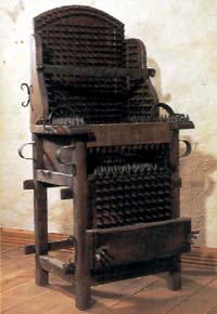 Hey, ein Abendmahl mit Hunden, Gauklern, betrunkenen Deutschen und Zwergen, nicht nur Christus und die Jünger, sondern eine riesige Festgemeinde, die gut gelaunt feierte. Das war zuviel, jedenfalls für den Vatikan. Am 18. Juli 1573 wurde der Maler Paolo Veronese vor das Inquisitionstribunal in Venedig geladen. Das Protokoll dieser Sitzung ist ein aufschlußreiches Zeugnis der Methoden und Gedankengänge des Heiligen Officiums und des Selbstverständnisses eines Malers wie Veronese. Der Geist der Gegenreformation ist nicht nur in der direkten Erwähnung der ketzerischen Deutschen spürbar, sondern auch in der Tatsache, daß das empörende Gemälde, das hier verhandelt wird, bereits 3 Monate im Kloster hing, ohne Anstoß zu erregen, bis es den Richtern verdächtig erschien. Veronese versucht sich als den naiven, unreflektierten Ausstatter darzustellen, der Michelangelo als Kronzeugen für die künstlerische Freiheit bemüht und ansonsten bereitwillig Auskunft über sich, die Figuren seines Abendmahls und seinen Umgang mit der Bibelvorlage gibt. Glücklicherweise schaffte es Veronese, das Gericht zu überzeugen und wurde schließlich zu einer Änderung verurteilt und nicht verbrannt. Um dem Streß zu entgehen, taufte er sein Gemälde um und nannte es fortan das Gastmahl des Levi. Er hatte also Glück. Wenn ich aber schon dieses Thema anspreche, dann waren es nur wenige, die der Inquisition entgehen konnten. Eine Vielzahl von Menschen wurden damals der Ketzerei bezichtigt und starben einen qualvollen Tod. Ohne viele Worte zeige ich dir vier originale Gegenstände aus dem Museum. Ein Befragungsstuhl, eine Scharfrichtermaske und zwei Schandmasken. Damit kannst du dir einen Bruchteil des dunkelsten Kapitels der katholischen Kirche vorstellen.