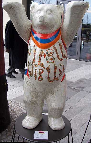 Interpretation: Meinen armenischen Namen habe ich von meinem Großvater Samson, dessen Pfeife in unserer Familie als wertvolles Relikt aufgehoben wird. Um die verblichene Inschrift auf dem Mundstück der Pfeife zu entziffern, erlernte ich schon früh das armenische Alphabet. Nun ist dieses auf die Brust meines Bären geschrieben: „HAJASTAN?(Armenien), zusammengesetzt aus Großbuchstaben aus alten armenischen Manuskripten.