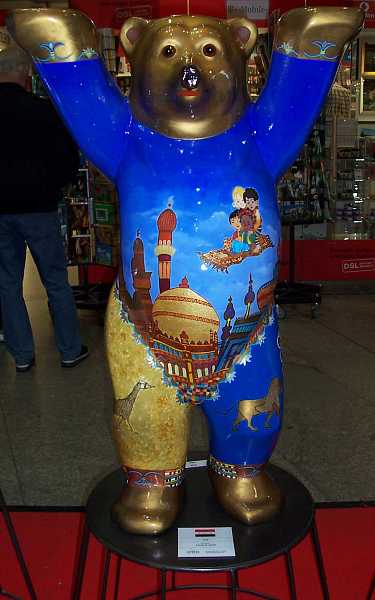 Interpretation: Der Bär ist Bestandteil vieler Träume und Geschichten der meisten Kinder dieser Welt. Das ist der Grund für die träumerischen und erzählenden Bilder, die ich auf den Buddy Bären gemalt habe. Die Bilder sind an Historie und Volkssagen meines Landes angelehnt, um die Phantasie irakischer Kinder darzustellen, die in ihre Träume flüchten müssen, um der grausamen Realität zu entfliehen.