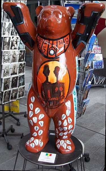 Interpretation: Der Bär selbst erinnert an die Kultur der „Dogong Die Dogon sind wegen ihres starken Bewusstseins zur eigenen Tradition und zum Spirituellem zur Gruppe der Weltkulturerben von UNESCO aufgenommen worden. Die Dogon pflegen strengstens ihre Kultur seit vielen Jahrhunderten - man hat Grabhöhlen gefunden, die zeitlich bis zum 11. Jahrhundert reichen. Ein zentraler Punkt der in Dogon-Kultur ist die Toguna, das zentrale Thema für meine Gestaltung des Bären. Die Toguna ist das Zentrum eines jeden Dogon-Dorfes, das Ratsgebäude - extra niedrig gebaut, verhindert es das verärgerte Aufbrausen der beratenden Männer im Streit.