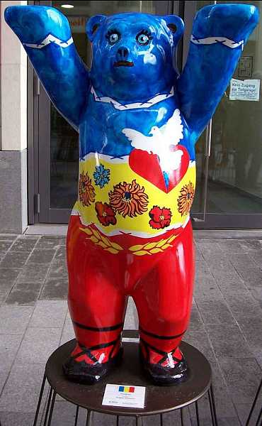 Interpretation: Als Grundlage für mein Werk habe ich die rumänischen Nationalfarben gewählt, rot-gelb-blau. Hierauf baut alles andere auf. Die Farben stehen jeweils für eine Besonderheit des Landes: Rot steht für das Blut, das in zahlreichen Schlachten vergossen wurde. Gelb symbolisiert die reiche Ernte der fruchbaren Böden. Und schließlich erinnert das Blau an einen strahlend-blauen, wolkenlosen Himmel. Seit jeher war Rumänien ein friedliebendes Land, dass fremden Völkern und Kulturen gegenüber sehr aufgeschlossen war und auch heute ist.