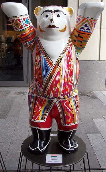 Interpretation: Mein Bär heißt Bekhrus, was auf Tadschikish „Der beste Tag" bedeutet. Der beste Tag ist für einen Tadschiken derjenige, an dem Besuch kommt, eine gute Nachricht eintrifft, ein Kind geboren oder eine Hochzeit gefeiert wird. Der tadschikische Bär kann jeden Tag in einen solchen verwandeln. Er ist feierlich gekleidet, sein Gewand aus farbenfroher Seide ist mit traditionellen tadschikischen Stickereien und Patchwork bedeckt. Um die Hüften trägt der Bär gleich drei bestickte Tücher. Egal wo er auf einen Fremden oder Freund trifft - im Feld oder auf der Straße, er breitet das eine Tuch als Tischdecke aus, legt das andere Tuch auf den Boden, damit sein Gast darauf sitzen kann, holt aus dem dritten ein Stück Brot, eine Handvoll Dörrobst und andere Naschereien, und ruft: „Was für ein Tag! Lasst uns feiern! Herzlich willkommen!