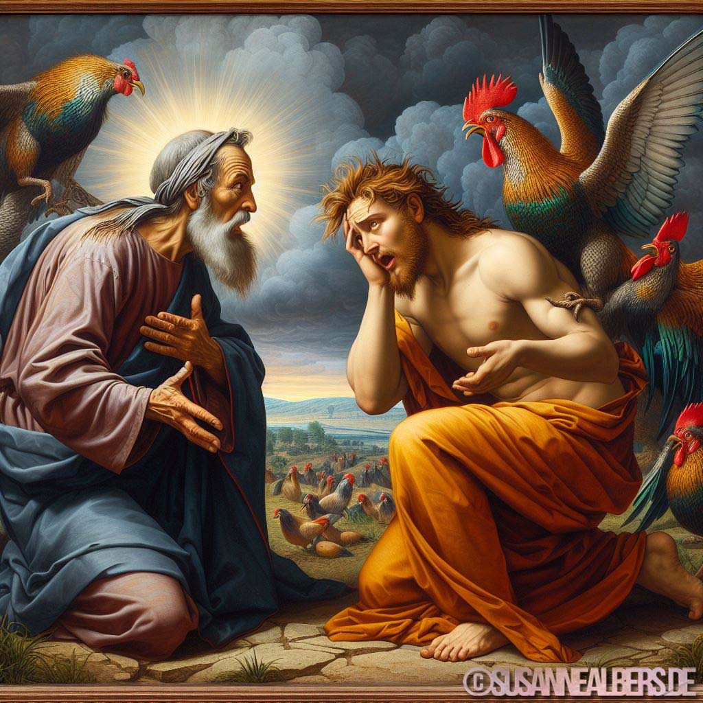 Galerie für KI-Bilder - Kunst und Inspiration >> albums >> -hahn-kraeht-petrus-hat-jesus-verleugnet