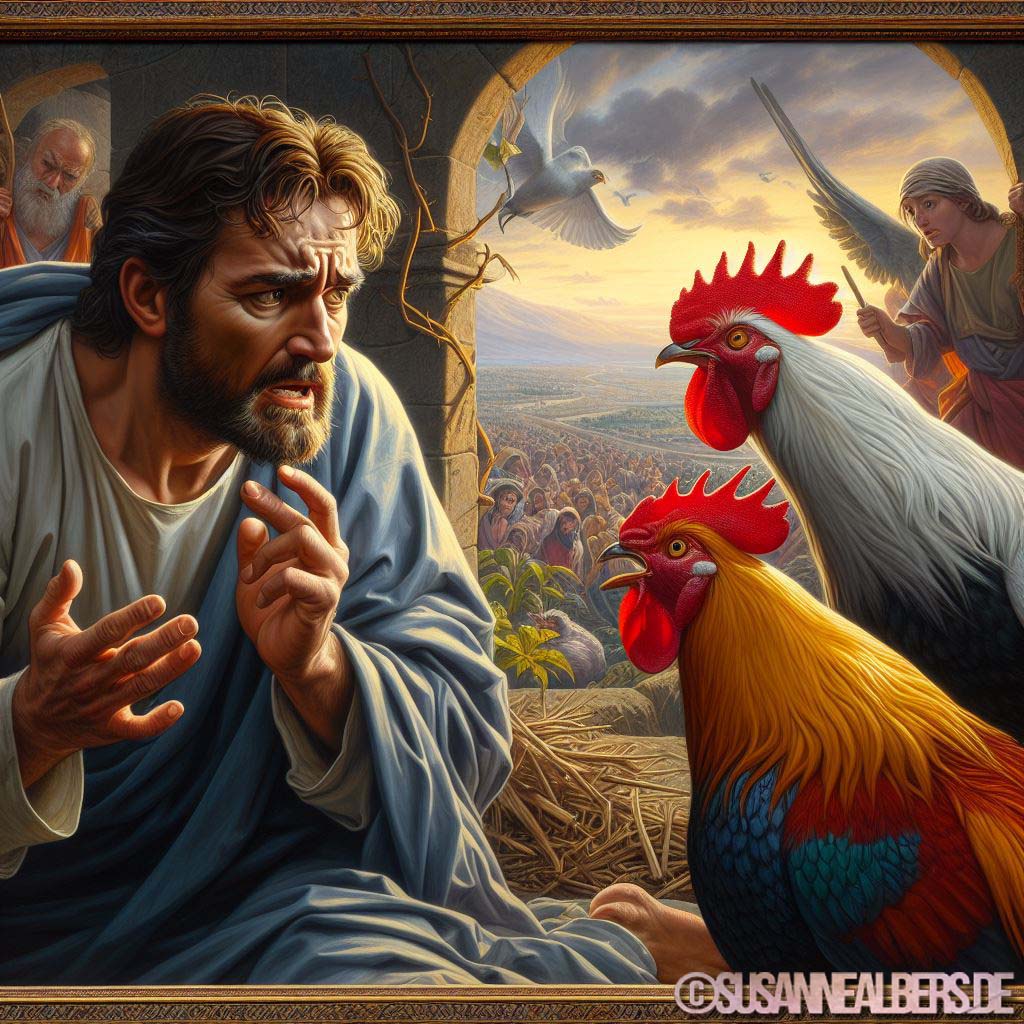 Galerie für KI-Bilder - Kunst und Inspiration >> albums >> -hahn-kraeht-petrus-hat-jesus-verleugnet