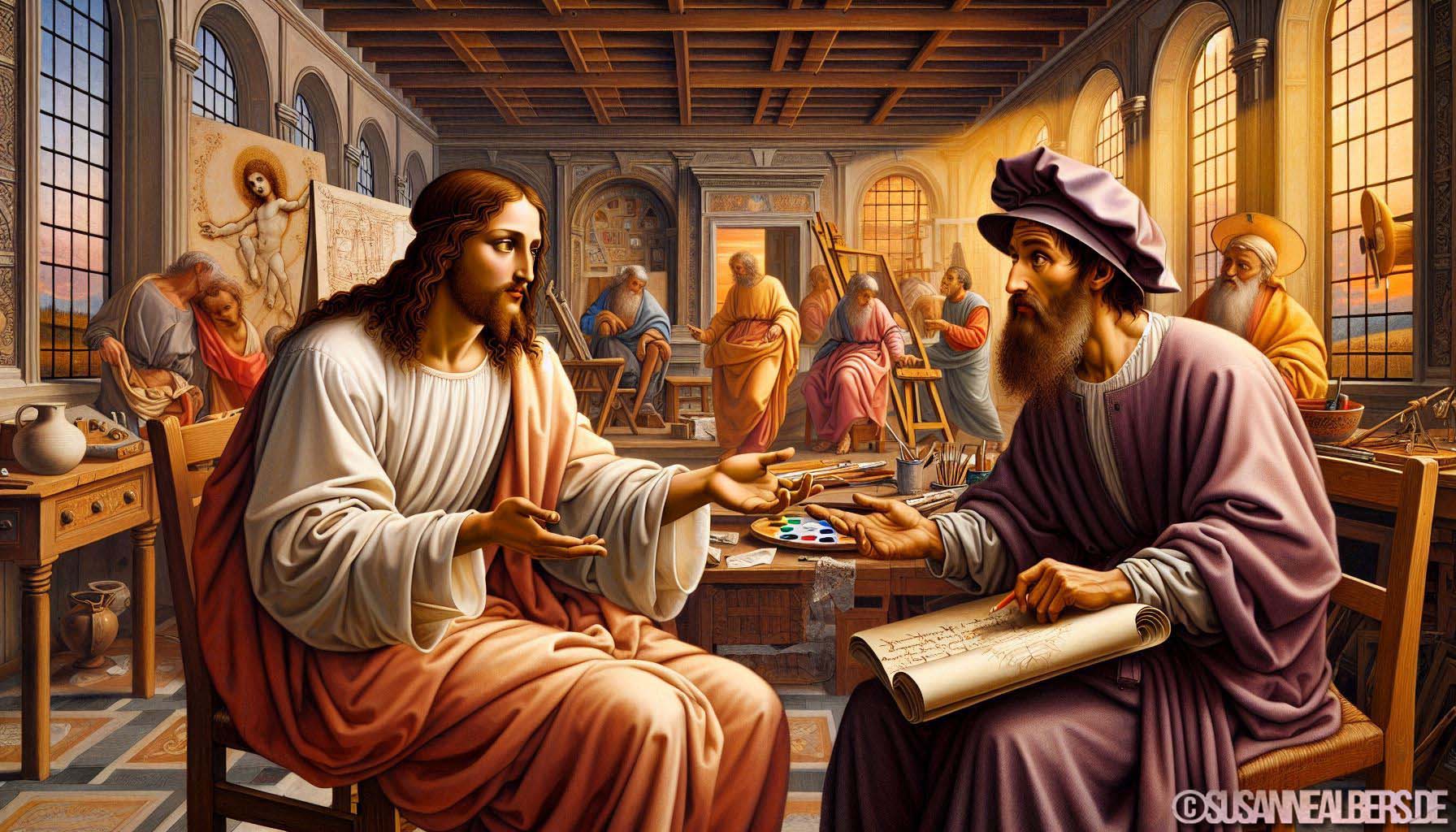 Galerie für KI-Bilder - Kunst und Inspiration >> albums >> -jesus-und-leonardo-im-gespraech-ueber-anatomie