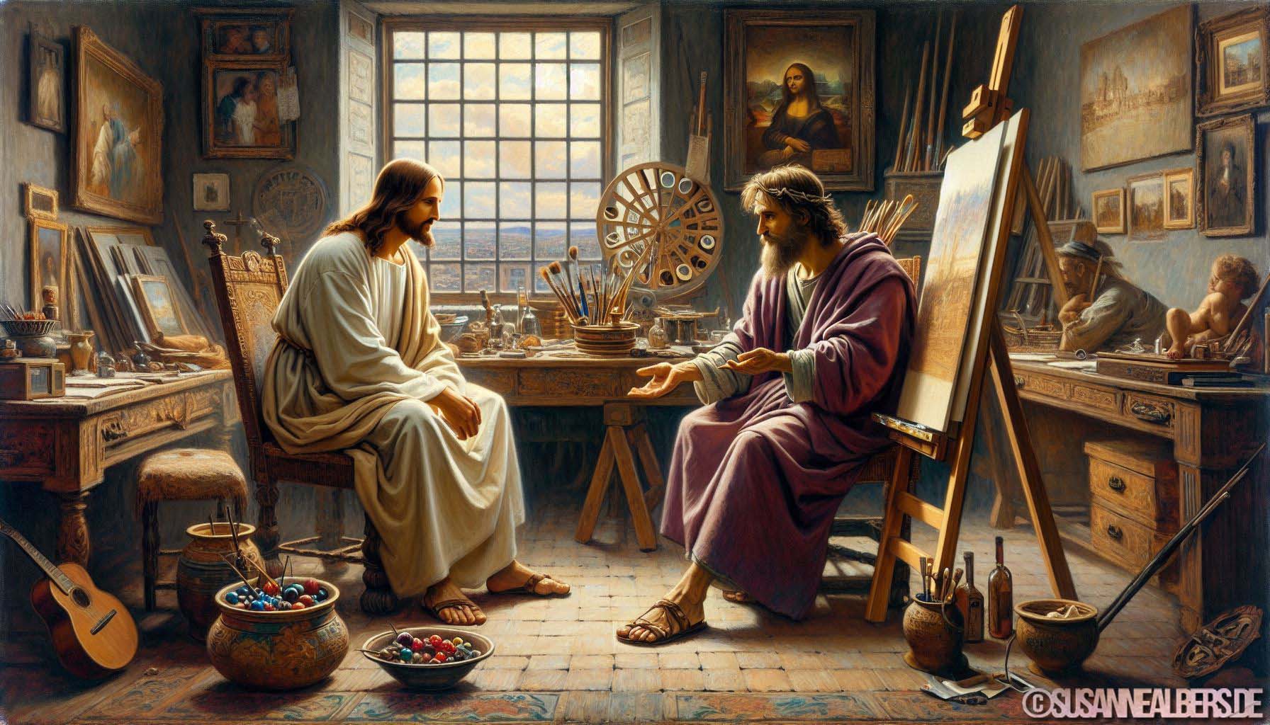 Galerie für KI-Bilder - Kunst und Inspiration >> albums >> -jesus-und-leonardo-im-gespraech-ueber-anatomie