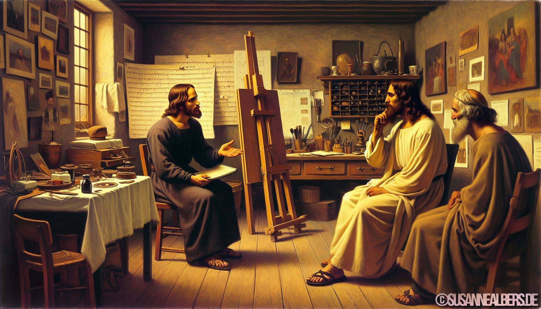 Galerie für KI-Bilder - Kunst und Inspiration >> albums >> -jesus-und-leonardo-im-gespraech-ueber-anatomie