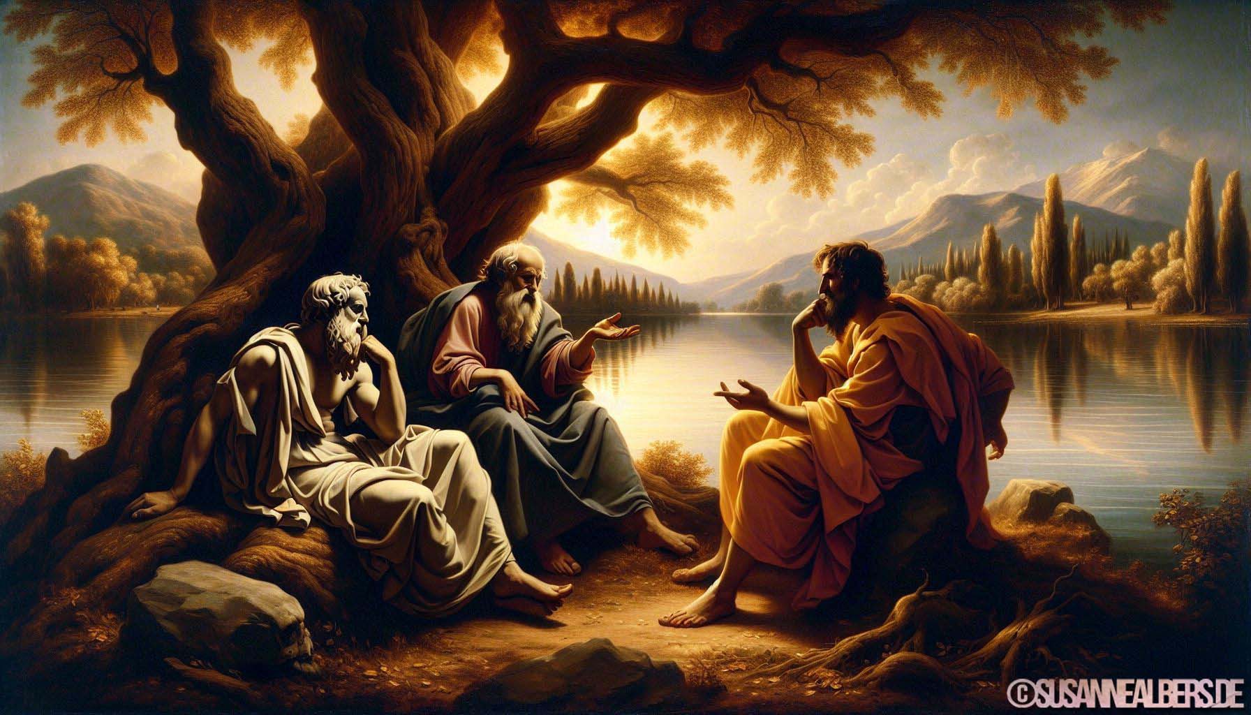 Galerie für KI-Bilder - Kunst und Inspiration >> albums >> -sokrates-platon-aristoteles-ueber-leben-und-tod