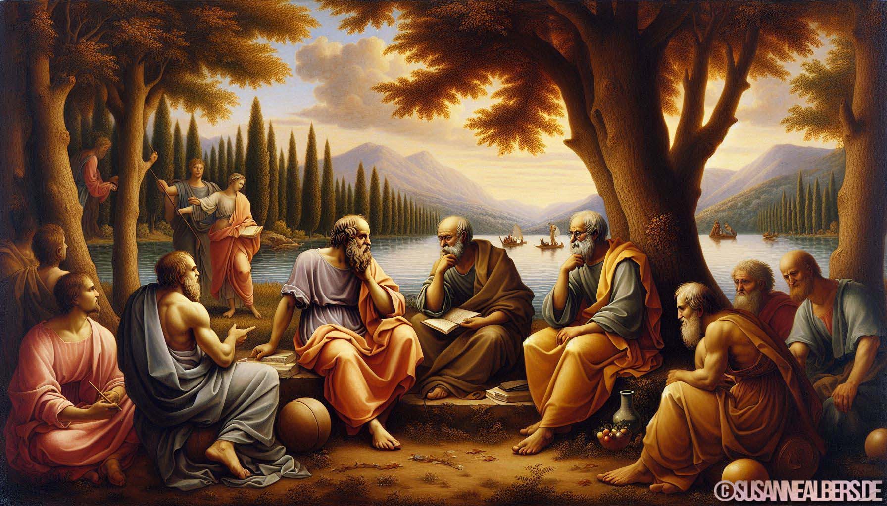 Galerie für KI-Bilder - Kunst und Inspiration >> albums >> -sokrates-platon-aristoteles-ueber-leben-und-tod