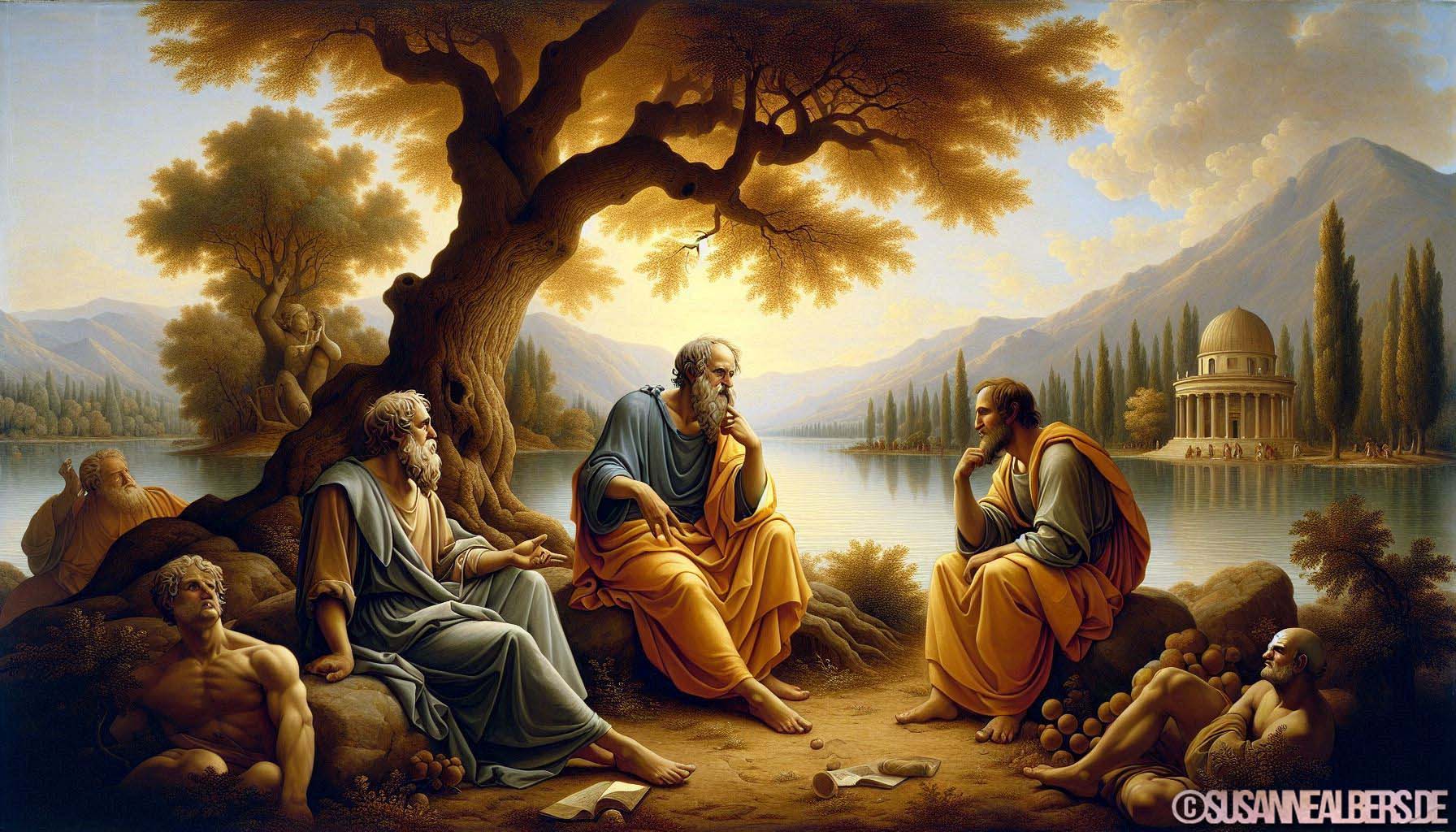 Galerie für KI-Bilder - Kunst und Inspiration >> albums >> -sokrates-platon-aristoteles-ueber-leben-und-tod