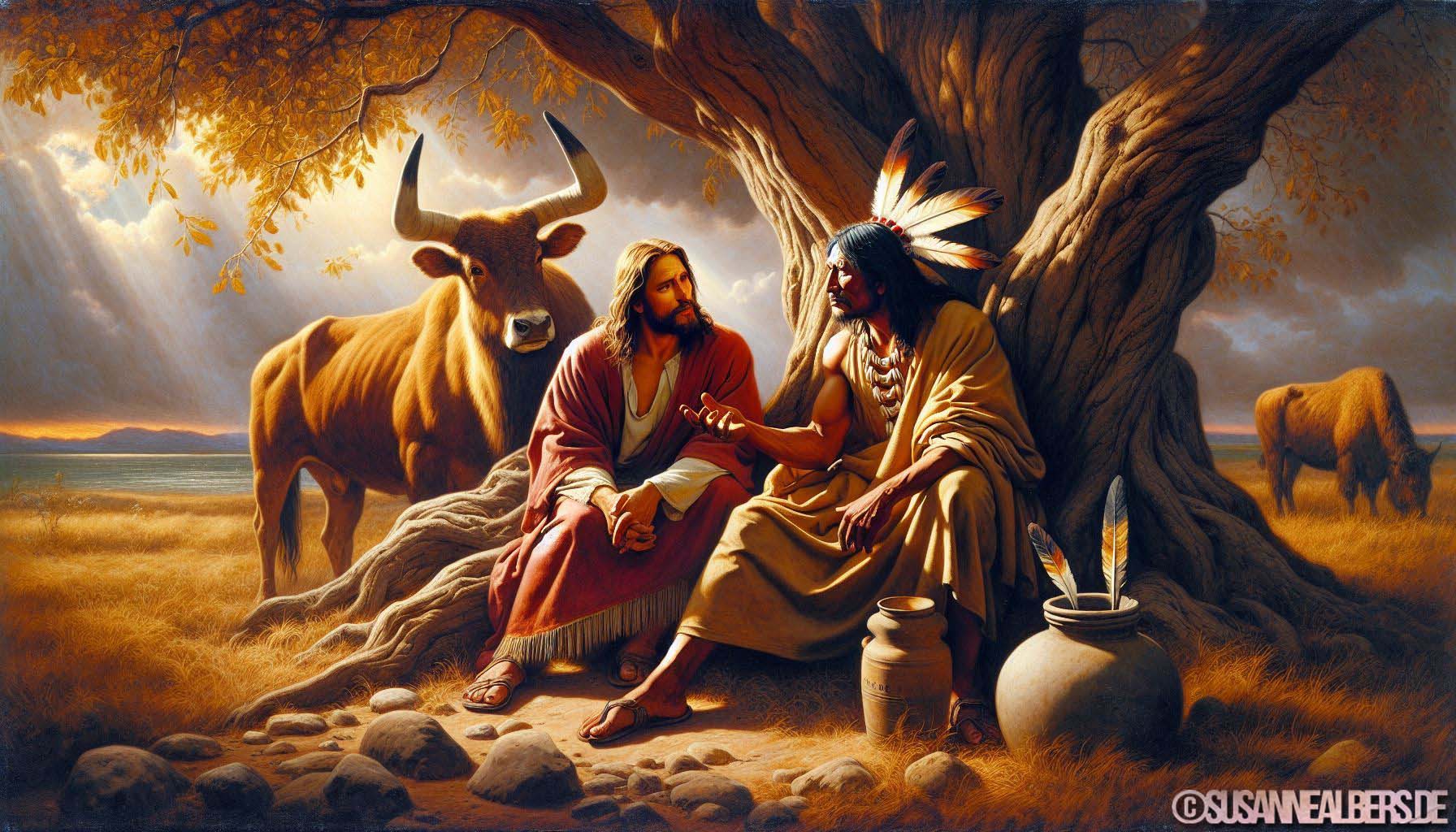 Galerie für KI-Bilder - Kunst und Inspiration >> albums >> -jesus-im-gespraech-mit-haeuptlingen-der-indianer