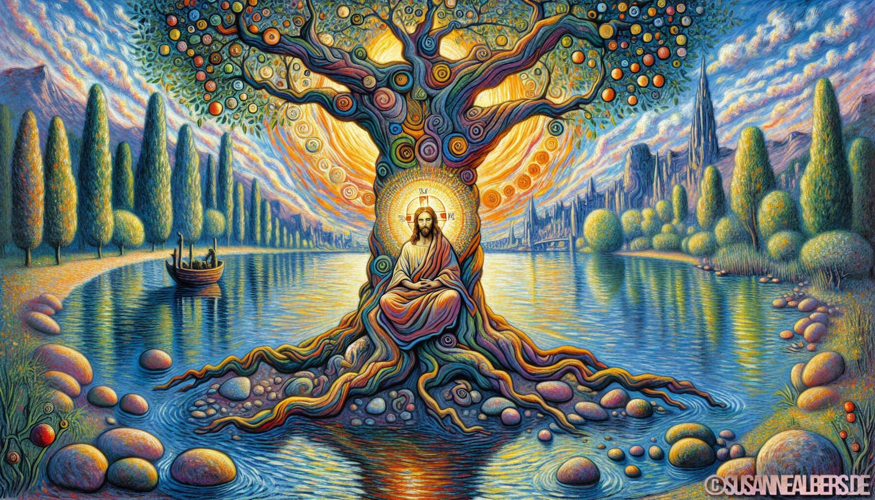 Galerie für KI-Bilder - Kunst und Inspiration >> albums >> -jesus-meditiert-an-baum-und-see