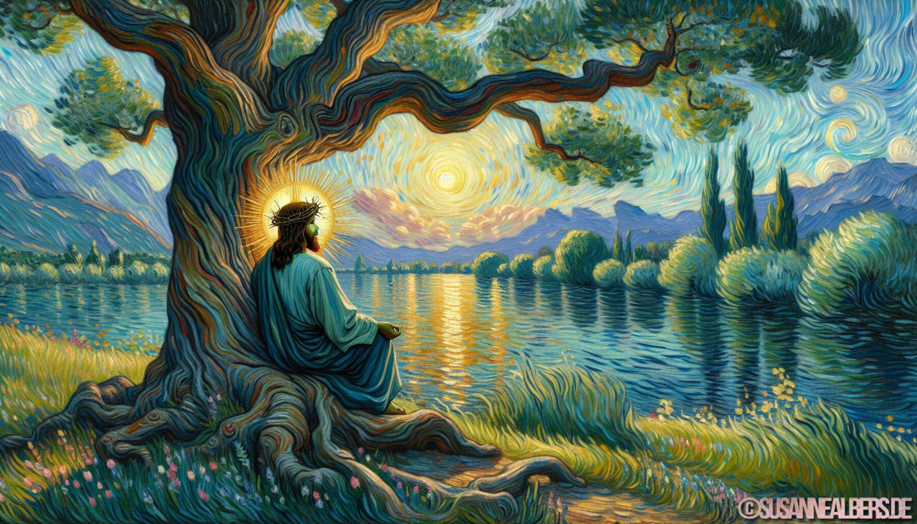 Galerie für KI-Bilder - Kunst und Inspiration >> albums >> -jesus-meditiert-an-baum-und-see