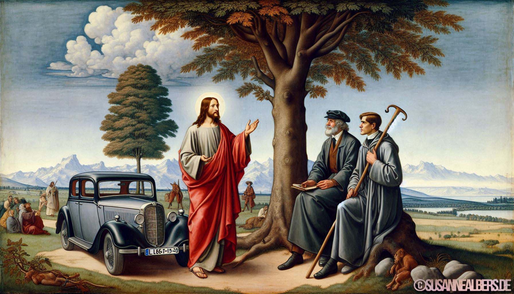 Galerie für KI-Bilder - Kunst und Inspiration >> albums >> -jesus-und-carl-benz-im-gespraech