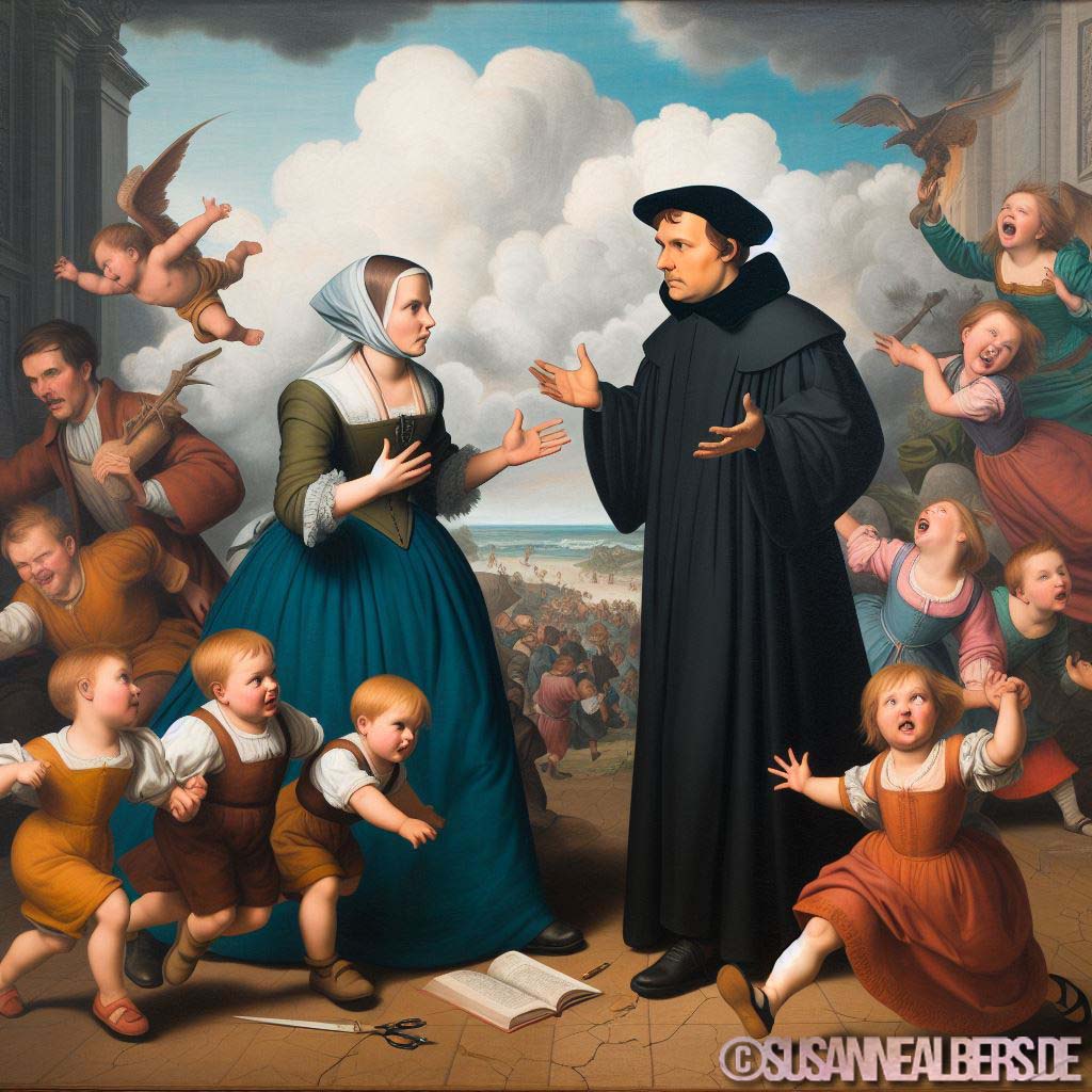 Galerie für KI-Bilder - Kunst und Inspiration >> albums >> -luther-und-bora-streiten-ueber-kindererziehung