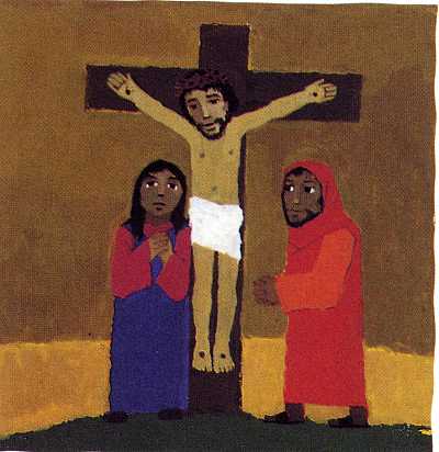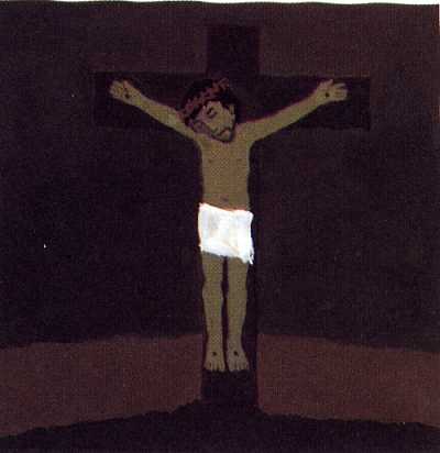 Die Soldaten nageln Jesus ans Kreuz. Nur seine Mutter Maria ist da, Plötzlich wird es am hellen Tag finster.
