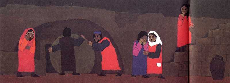 Die Männer rollen einen Stein vor das Grab.