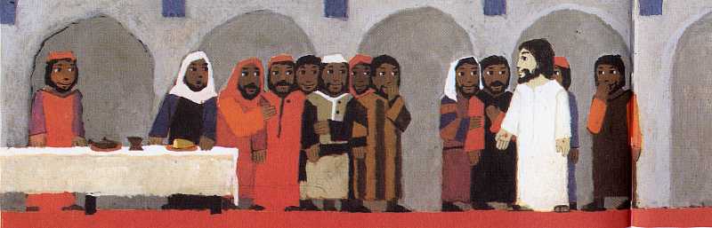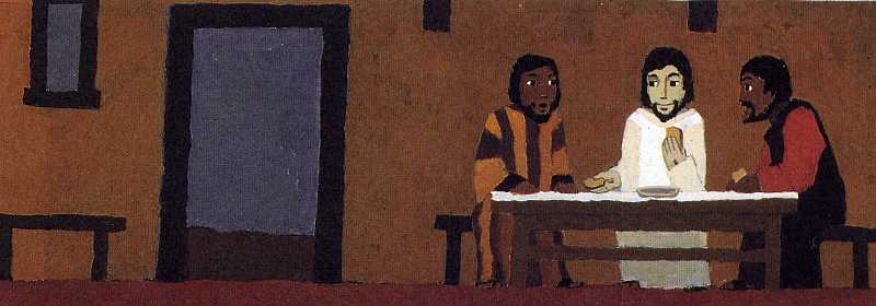 Bei Tisch nimmt Jesus das Brot.