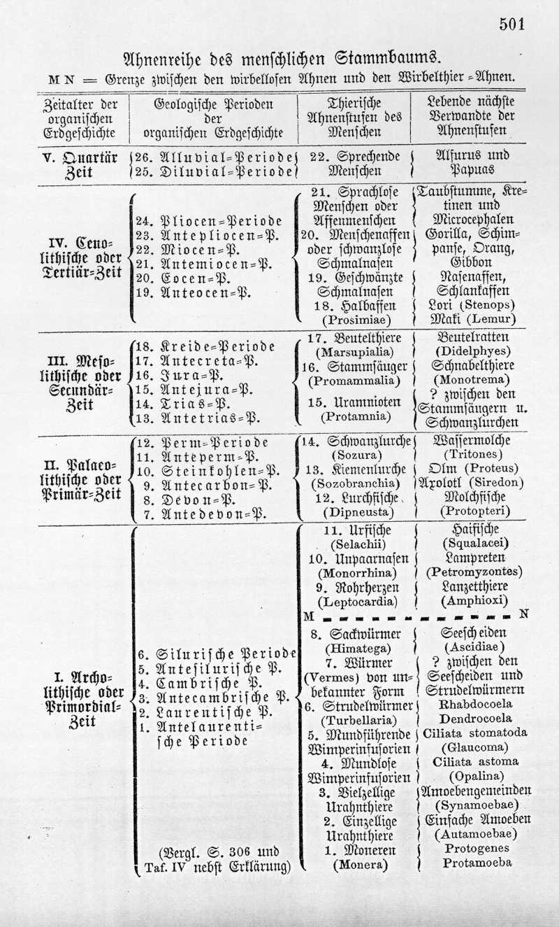 Erste Stufe: Moneren (Monera): Organismen der denkbar einfachsten Art, ohne Organe, bestehend aus einem ganz einfachen, durch und durch gleichartigen, structurlosen und formlosen Klümpchen einer schleimartigen oder eiweißartigen Materie; ähnlich der heute noch lebenden Protamoeba primitiva (Vergl. s. 144, Fig. 1, S. 283). Entstanden durch Urzeugung oder Archigonie aus sogenannten "anorganischen Verbindungen", aus einfachen und festen Kohlenstoffverbindungen (im Beginn der antelaurentischen Zeit.). Zweite Stufe: Einzellige Urahnthiere (Archezoa unicellularia) oder Einfache Amoeben (Amoebae), nackte Zellen (oder membranlose, kernhaltige Plastiden), bestehend aus einem structurlosen Protoplasmaklümpchen, in dessen Innerem ein Kern gesondert ist; ähnlich den heute noch lebenden einfachen nackten Amoeben (Autamoeba etc., vergl. S. 145, Fig. 2). Entstanden aus den Moneren durch Differenzirung des inneren Kerns von dem äußeren Protoplasma. Der Formwerth dieser Amoebenstufe ist gleich demjenigen, welchen das menschliche Ei (S. 146, Fig. 3) noch heute besitzt. Das Ei ist eine einfache, von einer Membran umschlossene Zelle, so gut wie eine eingekapselte Amoebe (Vergl. S. 145, Fig. 2A). Dritte Stufe: Mehrzellige Urahnthiere (Archezoa mulicellularia) oder Amoebengemeinden (Synamoebae): Einfache Haufen von gleichartigen Nacktzellen, bestehend aus einer Colonie von mehreren, an einanderliegenden, einfachen und gleichartigen, amoebenähnlichen Zellen. Entstanden aus einfachen Amoeben durch wiederholte Theilung derselben und Beisammenbleiben der Theilungsprodukte. Der Formwerth dieser Stufe ist gleich demjenigen des menschlichen Eies nach vollendeter Furchung oder Theilung, ehe noch die gleichartigen Zellen sich differenzirt haben (Vergl. S. 146, Fig. 4D). Vierte Stufe: Mundlose Wimperinfusorien (Ciliata astoma), bestehend aus einem Haufen von mehr oder weniger gesonderten Zellen, von denen die an der Oberfläche gelegenen schlagende Wimperhaare gebildet haben und so den Zellenhaufen mit einem Flimmerepithel überziehen, mittelst dessen sich derselbe rotirend im Wasser umher bewegt. Entstanden aus der Synamoebe oder Amoebengemeinde durch Differenzirung der oberflächlichen Zellen zu Wimperzellen. Der Formwerth dieser Stufe ist gleich demjenigen der Wimperlarve (Planula), welche bei den meisten niederen Thieren zunächst aus dem gefürchten Ei entsteht. Bei den Wirbelthieren, wie bei den Gliedfüßern, ist dieses Stadium, ebenso wie die beiden folgenden, im Laufe der Zeit durch abgekürzte Vererbung (S. 166) verloren gegangen. Aehnliche mundlose Wimperinfusorien (Opalina) leben noch heute (Vergl. S. 405). Fünfte Stufe: Mundführende Wimperinfusorien (Ciliata stomatoda), der vierten Stufe ähnlich, aber verschieden durch eine einfache, in das Innere des vielzelligen Körpers hineingehende und dort blind endigende Röhre, die erste Anlage des Darmkanals, dessen einzige Oeffnung zugleich Mund und After ist. Entstanden aus den mundlosen Infusorien durch Bildung einer immer mehr sich vertiefenden Grube oder Einstülpung an einer Stelle der äußeren Körperoberfläche. Der Formwerth dieser Stufe entspricht demjenigen, welchen die Wimperlarve oder Planula der niederen Thiere bei ihrer weiteren Entwickelung durch Anlage des Darms zunächst erreicht. Sechste Stufe: Strudelwürmer (Turbellaria), Plattwürmer von einfachster Gestalt, gleich den Wimperinfusorien auf der ganzen Körperoberfläche mit Wimpern überzogen. Einfacher blattförmiger Körper von länglichrunder Gestalt ohne alle Anhänge. Einstanden aus den mundführenden Wimperinfusorien durch weitere Differenzirung der inneren Körpertheile zu verschiedenen Organen; insbesondere erste Bildung des Nervensystems (enes einfachen Nervenknotens) und der einfachsten Sinnesorgane (Pigmentflecke als Anlage der Augen); ferner weitere Ausbildung der bei den Infusorien bereits sich anlegenden einfachsten Organe für Ausscheidung (wimpernde innere Kanäle, durch eine contractile Blase ausmündend) und Fortpflanzung (hermaphroditische oder zwitterige Geschlechtsorgane). Der Formwerth dieser Stufe entspricht demjenigen der einfachsten heute noch lebenden Strudelwürmer (Turbellaria, vergl. S. 406). Siebente Stufe: Würmer (Vermes) von unbekannter Form, welche den Uebergang zwischen der sechsten und achten Stufe, zwischen den Strudelwürmern und Sackwürmern vermittelten. Entstanden aus den Strudelwürmern durch Umbildung des vordersten Darmabschnittes zum Athmungsapparat (Kiemenkorb), durch Bildung eines Afters am hinteren Darmende und durch Verlust des Wimperkleides. Der Formwerth dieser Stufe wird in der weiten Lücke zwischen Strudelwürmern und Mantelthieren durch verschiedene Zwischenstufen vertreten sein. Achte Stufe: Sackwürmer (Himatega), welche von allen heute uns bekannten Würmern den Mantelthieren (Tunicata) am nächsten standen, und zwar den frei umherschwimmenden Jugendformen oder Larven der eigentlichen Seescheiden (Ascidia, Phallusia) (Vergl. S. 409 und 438). Entstanden aus den Würmern der siebenten Stufe durch Umbildung des einfachen Nervenknotens zur Anlage eines Rückenmarks (Medullarrohrs) und eines darunter gelegenen Rückenstranges (Chorda dorsalis). Der Formwerth dieser Stufe entspricht ungefähr demjenigen, welchen die genannten Larven der einfachen Seescheiden zu der Zeit besitzen, wo sie die Anlage des Rückenmarks und des Rückenstranges zeigen. Zweite Hälfte der menschlichen Ahnenreihe: Wirbelthier-Ahnen des Menschen. Neunte Stufe: Schädellose oder Rohrherzen (Acrania oder Leptocardia), von entfernter Aehnlichkeit mit dem heute noch lebenden Lanzetthiere (Amphioxus lanceolatus, vergl. S. 437). Körper noch ohne Kopf, ohne Schädel und Gehirn, vorn und hinten gleichmäßig zugespitzt. Entstanden während der Primordialzeit aus den Sackwürmern der achten Stufe durch weitere Differenzirung aller Organe, namentlich vollständigere Entwickelung des Rückenmarks und des darunter gelegenen Rückenstrangs. Wahrscheinlich begann mit di