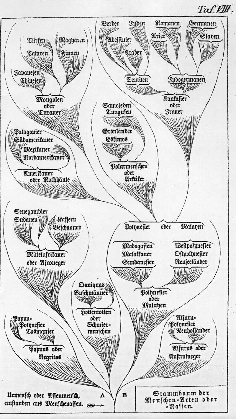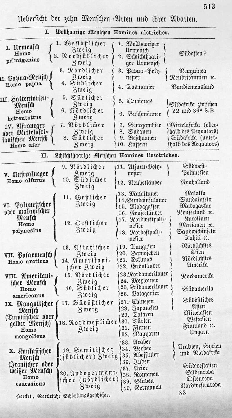 Die erste Menschenart würde der längst ausgestorbenen Urmensch (Homo primigenius oder Pithecanthropus primigenius) bilden, den wir nach der einheitlichen oder monophyletischen Descendenz-Hypothese als die unmittelbare Uebergangsform vom menschenähnlichsten Affen zum Menschen und als die gemeinsame Stammform aller übrigen Menschenarten zu betrachten hätten (Vergl. Taf. VIII). Bei der außerordentlichen Aehnlichkeit, welche sich zwischen den niedersten wollhaarigen Menschen und den höchsten Menschenaffen selbst jetzt noch erhalten hat, bedarf es nur geringer Einbildungskraft, um sich zwischen Beiden eine vermittelnde Zwischenform und in dieser ein ungefähres Bild von dem muthmaßlichen Urmenschen oder Affenmenschen vorzustellen. Die Schädelform desselben wird sehr langköpfig und schiefzähnig gewesen sein, das Haar wollig, die Hautfarbe dunkel, bräunlich oder schwärzlich. Die Behaarung des ganzen Körpers wird dichter als bei allen jetzt lebenden Menschenarten gewesen sein, die Arme im Verhältniß länger und stärker, die Beine dagegen kürzer und dünner, mit ganz unentwickelten Waden; der Gang nur halb aufrecht, mit stark eigebogenen Knieen. Von den jetzt existirenden Festländern kann allen bekannten Anzeichen nach weder Amerika, noch Europa, noch Australien die Heimath dieses Urmenschen, und somit die Urheimath des Menschengeschlechts überhaupt gewesen sein. Vielmehr deuten die meisten Anzeichen auf das südliche Asien. Vielleicht war aber auch das östliche Afrika der Ort, an welchem zuerst die Entstehung des Urmenschen aus den menschenähnlichen Affen erfolgte; vielleicht auch ein jetzt unter den Spiegel des indischen Oceans versunkener Kontinent, welcher sich im Süden des jetzigen Asiens einerseits östlich bis nach den Sunda-Inseln, andrerseits westlich bis nach Madagaskar und Afrika erstreckte. Wahrscheinlich entwickelten sich aus dieser Urmenschenart durch natürliche Züchtung verschiedene, uns unbekannte, jetzt längst ausgestorbene Menschenarten, von denen zwei am meisten divergente, eine wollhaarige Art und eine schlichthaarige Art, im Kampf um's Dasein über die übrigen den Sieg davon trugen, und die Stammformen der übrigen Menschenarten wurden. Der wollhaarige Zweig breitete sich zunächst südlich des Aequators aus, indem er sich theils nach Osten (nach Neuguinea), theils nach Westen (nach Südafrika) hinüberwandte. Der schlichthaarige Zweig dagegen wandte sich hauptsächlich nach Norden und bevölkerte zunächst Asien; ein Theil desselben wurde aber nach Australien verschlagen, und erhob sich hier nur wenig über die tiefe Stufe der ursprünglichen Bildung. Alle heute noch lebenden wollhaarigen Völker (Ulotriches) sind auf einer viel tieferen Stufe der Ausbildung stehen geblieben, als die meisten schlichthaarigen. Sie alle haben die langköpfige und schiefzähnige Schädelform und die dunkle Hautfarbe beibehalten. Der ursprünglichen Stammform des wollhaarigen Astes in mancher Beziehung am nächsten steht vielleicht der Papua-Mensch oder Negrito (Homo papua), welcher zerstreut auf einzelnen Inselgruppen des südasiatischen und des australischen Archipelagus lebt, auf Neuguinea, Neubritannien, den Salomonsinseln u. s. w. Auch die kürzlich ausgestorbenen Bewohner von Tasmanien (Vandiemensland) gehörten hierher. Die Hautfarbe ist schwarz oder schwarzbraun, das Haupthaar meistens eine mächtige wollige Perücke. Während einige Zweige dieser Menschenart sich in verhältnißmäßig hohem Grade der Kultur zugängig gezeigt haben, sind andere dagegen auf der niedrigsten Stufe der Menschheit stehengeblieben. Das letztere gilt auch von den nächstverwandten Hottentotten oder Schmiermenschen (Homo hottentottus), worunter wir nicht bloß die echten Hottentotten oder Quaiquas, sondern auch die viehischen Buschmänner und einige andere nächstverwandte Stämme des südlichsten Afrika begreifen. Zwar werden dieselben gewöhnlich mit der folgenden Art, den echten Negern vereinigt. Allein sie unterscheiden sich von diesen in mancher Beziehung, namentlich durch die hellere, mehr gelblich braune Hautfarbe. Dagegen schließen sie sich durch die büschelförmige Sonderung des Haares und andere Eigenheiten mehr dem Papua-Menschen an, so daß wir sie wohl als den Rest einer Zwischenart betrachten können, welche den Uebergang vom Papua-Neger zum echten, mittelafrikanischen Neger vermittelte. Wahrscheinlich stammen sie von einem Zweige des Papua-Menschen ab, der nach Südwesten wanderte. Eine vierte und letzte Art unter der Reihe der wollhaarigen Menschen bildet der echte Neger oder Afroneger, der Mittelafrikanische oder äthiopische Mensch (Homo afer oder niger). Hierher gehört die große Mehrzahl der Bewohner Afrikas, mit Ausnahme der kaukasichen Bewohner des nördlichen Afrika und der Hottentotten der Südspitze. Wahrscheinlich entstand diese Art direct oder indirect ebenfalls aus einem nach Westen gewanderten Zweige der Papua-Neger, vielleicht durch Vermittelung der Hottentotten-Art. Wie bei den vorhergehenden Arten, ist die Hautfarbe dunkel, geht jedoch öfter in reines Schwarz über, während sie allerdings bei einigen nördlichen Stämmen auch hell gelblich braun wird. Man kann diese Menschenart in zwei divergente Zweige eintheilen, von denen der südliche die Kaffern und Beschuanen, die nördliche die Senegambier und Sudanen umfaßt. Unter der zweiten Reihe der Menschenarten, den schlichthaarigen Völkern (Lissotriches), sind auf der tiefsten Stufe die Neuholländer oder Australneger stehen geblieben, auch "Alfurus" (im engeren Sinne) genannt (Homo alfurus oder australis). Es gehören hierher die affenartigen Ureinwohner Australiens, sowie die Alfuru-Polynesier, d. h. ein Theil von der schlichthaarigen schwarzen Bevölkerung der Philippinen, Molukken und anderer südasiatischer und polynesischer Inselgruppen. In vielen körperlichen und geistigen Beziehungen stehen diese schwarzen, schlichthaarigen Stämme auf der tiefsten Stufe menschlicher Bildung, selbst noch un
