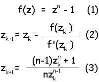 Nullstellen von Funktionen erhält man mit dem Interationverfahren von Newton. Dieses Verfahren führt auch bei komplexen Funktionen zum Ziel. Die Iterationformel (2) erhält speziell für f(z) die Gestalt (3). Dabei erhält man die Ableitung von f(z) nach der üblichen Regel für Parabel-Funktionen. Die komplexe Funktion f(z) hat nun die n Einheitswurzeln als Nullstellen. Jeder Zahl z aus der Zahlenebene ist nun Startwert einer Newtonfolge. Der Punkt wird danach eingefärbt, nach welcher Einheitswurzel die Folge konvergiert. |